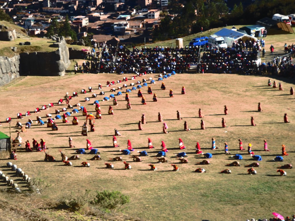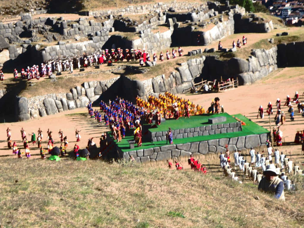 Una vez terminada esta celebración, la ceremonia sagrada del Inti Raymi continúaba en la ciudad de Sacsahuayman. Es la ciudad más cercana a Cuzco, configura con Cuzco la figura del Puma porque los Incas configuraban sus ciudades de acuerdo a sus animales sagrados. Sacsahuayman significa cabeza jaspeada. En el conjunto arquitectónico de Sacsahuayman se pueden apreciar muros en zigzag constituidos de piedras megalíticas y bases de torreones muy altos. También hay templos ceremoniales, una laguna artificial y un rodadero que es resultado del deshielo de un nevado. En la gran explanada de esta ciudad se escenifica la fiesta del Inti Raymi. A lo largo de la ceremonia sagrada hubo momentos mágicos, como por ejemplo, al iniciarse la celebración, de los cuatro puntos cardinales de la ciudad salieron los dirigentes de los suyos con sus comitivas descendiendo de las montañas en sus trajes ceremoniales; cada grupo entregaba una ofrenda a Atahualpa en honor al Dios Sol. El desfile de las doce diosas del sol que llevaban canastos de flores insinuando con los movimientos de sus brazos el ofrecimiento de las flores al Dios Sol. El silencio que por unos minutos invade ese gran espacio cuando Atahualpa pide al Tihuantisuyo un momento de recogimiento y adoración al Dios Sol. Finalmente, el sacrificio del corazón de la llama como ofrenda al Dios Sol. Toda la ceremonia revela un aspecto sagrado de esta cultura inca que aún sobrevive en las tradiciones de los pueblos amerindios de los Andes de Suramérica.
