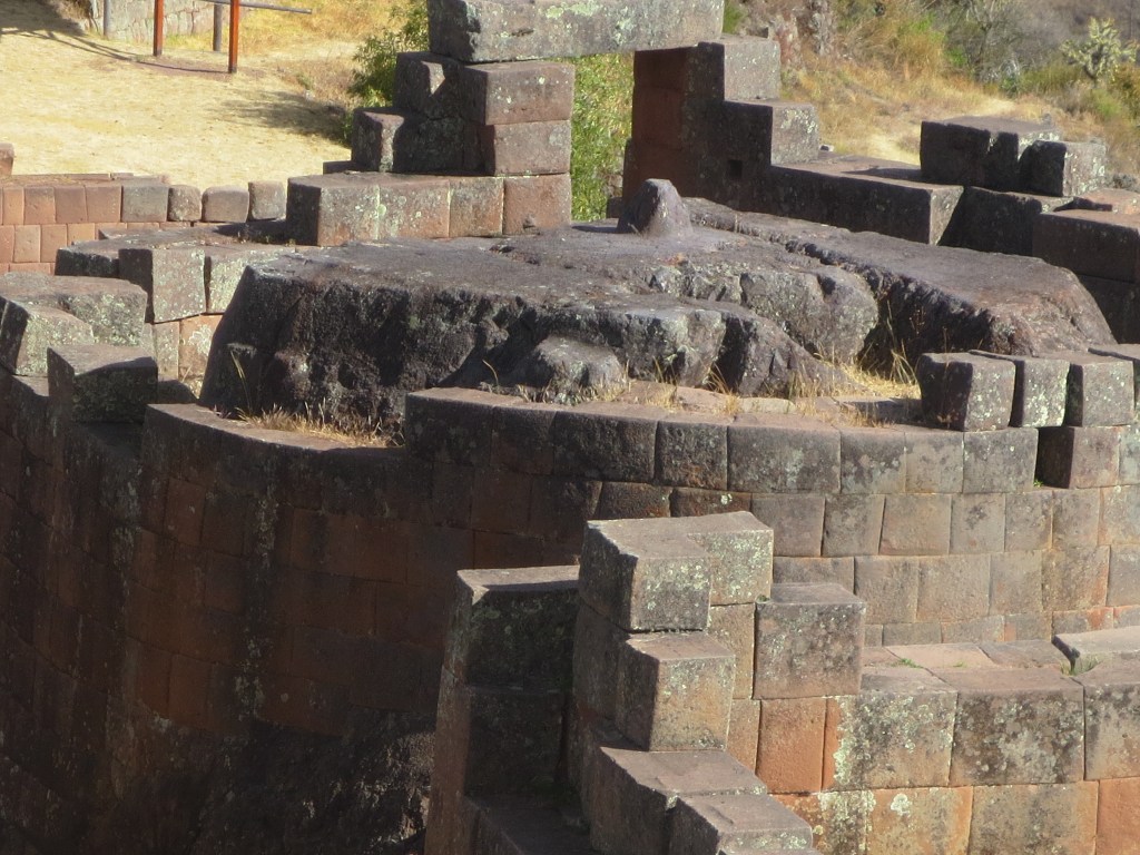 Continúamos el recorrido y llegamos a un lugar llamado Puca Pucara que significa en lengua quechua « Fortaleza Roja« . Según me explico el guía este lugar cumplía la función de retén y control territorial por su ubicación geográfica que comunica con varias ciudades del territorio peruano. Por este control pasaban mercaderes, chasquis (mensajeros) y comitivas administrativas que llegaban allí para reposar antes de continuar el viaje. Por lo tanto, el lugar también era un tambo, sitio de reposo. Puca Pucara tiene una construcción por niveles. La parte alta donde había una gran plazuela era para vigilar el territorio ya que este lugar está rodeado por una cadena de montañas magníficas. La parte baja orientada por senderos de piedra llevaba a las habitaciones y baños para estadías de corto plazo. En otro sector de la parte baja estaba la garita del control administrativo y de retén. Se dice que los chasquis o mensajeros encontraban en este lugar su relevo para continuar llevando los mensajes.