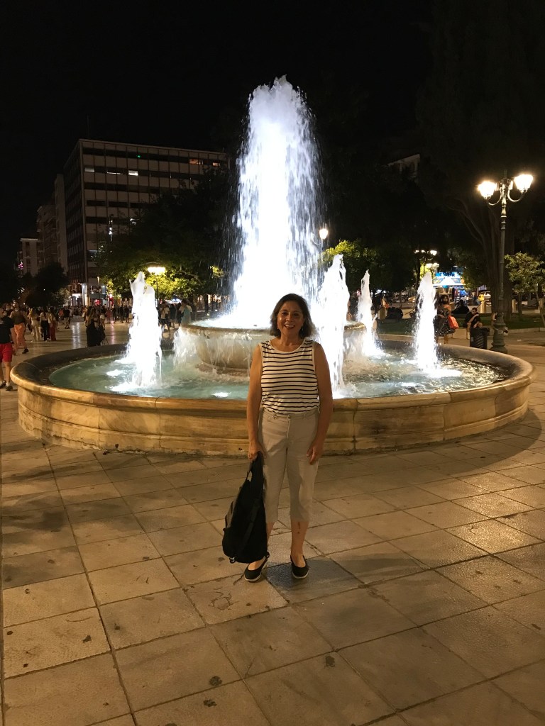 Al salir del aeropuerto Eleftherios Venizelos International en Atenas para tomar el tren que nos conduce al centro de la ciudad, Plaza Monastiraki tengo la impresión de que la gente en Atenas vive a un ritmo lento, sin prisa. El tren toma su tiempo en llegar y en conducirnos hasta el centro de la ciudad,Plaza Monastiraki. La estación Metro Monastirakii es central para comunicar en Metro con otros sectores de la ciudad. Llegué un día jueves y sabía que ese día el Museo Benaki era gratuito y que el horario de apertura se prolongaba hasta la medianoche. Como llegué a las siete de la noche a mi hospedaje tuve el tiempo suficiente para arreglarme e irme al museo Benaki. Al salir de la estación metro de la Plaza Sintagma un ambiente de fiesta reinaba allí con músicos que animaban el ambiente mientras grupos de jóvenes ocupaban la plaza, así como algunas familias que tomaban un helado en una noche agradable de calor. Una hermosa fuente de agua decoraba esta plaza.