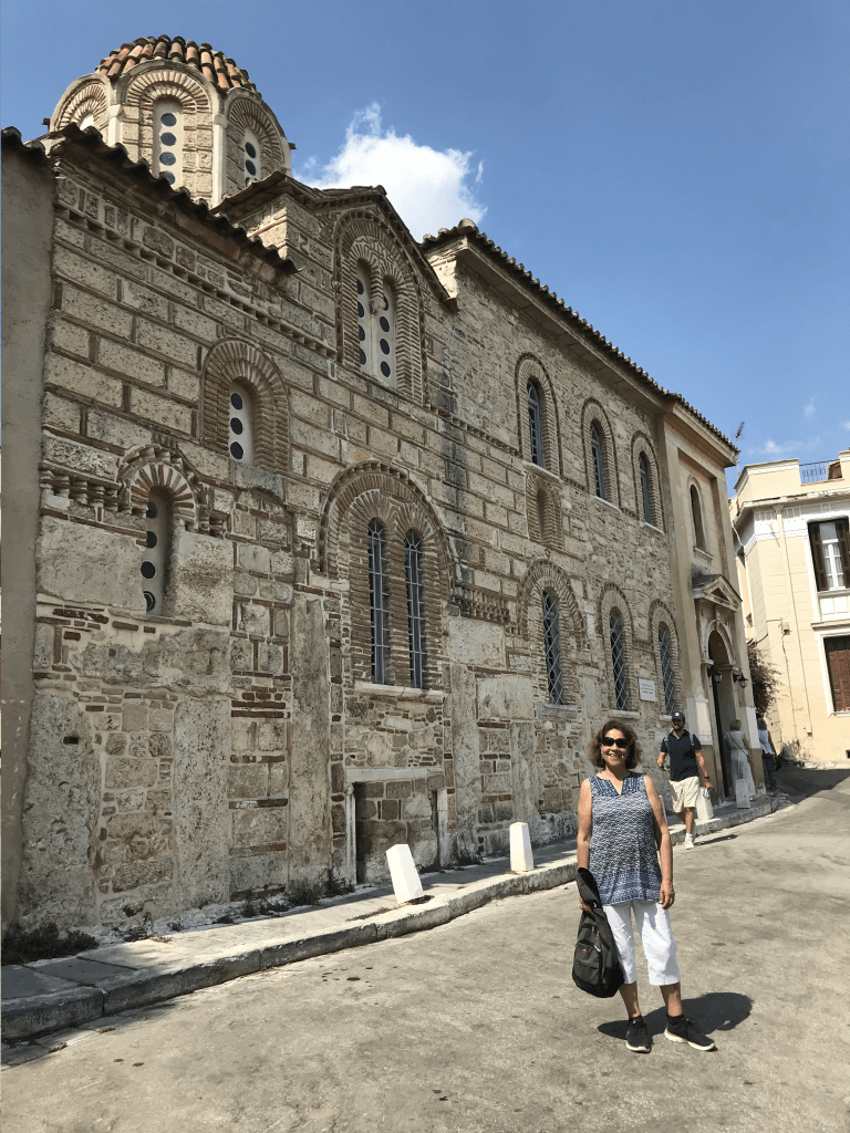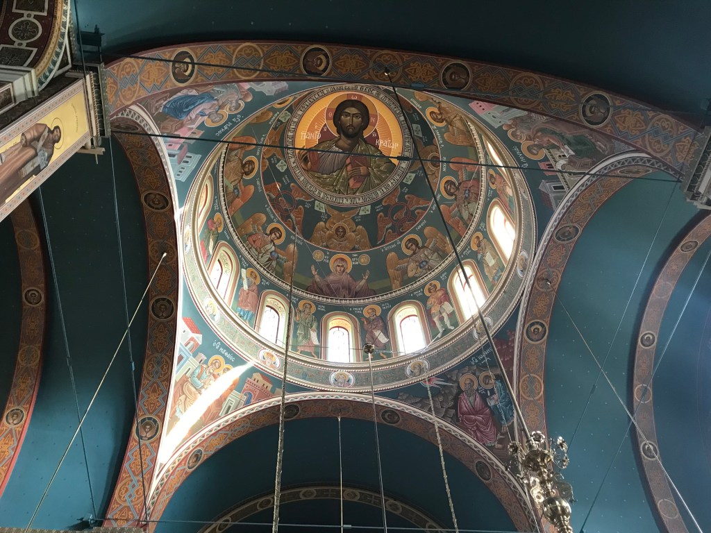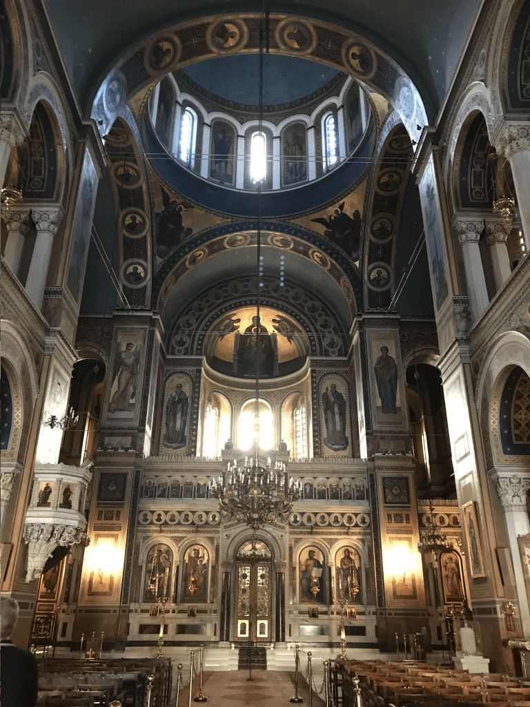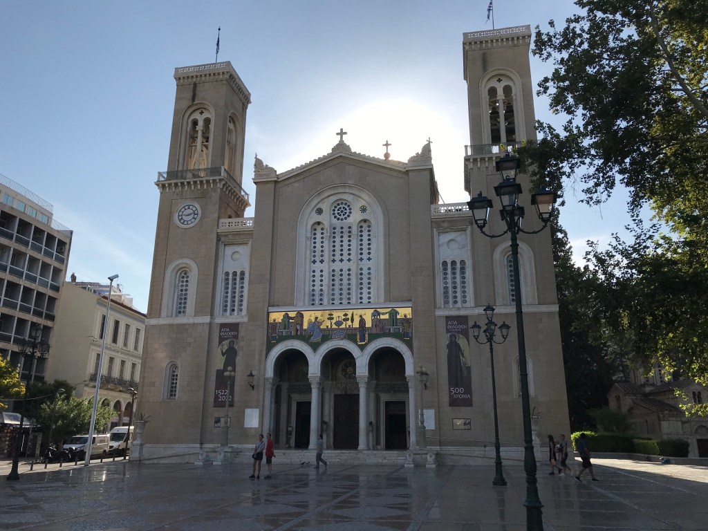 Al día siguiente de mi llegada, fui a desayunar en una cafetería situada en la Plaza Monastiraki. Un delicioso café con una Spanakopita, un hojaldre relleno de queso feta y espinaca. Después me dirigí al lugar donde tendría un tour guiado de Atenas con una guía peruana. Comenzamos el recorrido en la catedral Metropolitana de Atenas. Una catedral ortodoxa con objetos decorativos bellísimos, las enormes lámparas que penden de los techos; los frescos representando escenas bíblicas y los iconos de la Virgen y el niño, de Jesucristo, de los Arcángeles y de los padres representantes de la iglesia ortodoxa. La guía nos contaba que para los ortodoxos la cifra tres era muy importante. Cuando un creyente entra a la iglesia, le da la vuelta a la iglesia, parándose frente a los iconos que son fuente de devoción y en cada uno se persigna tres veces y le da un beso al icono.