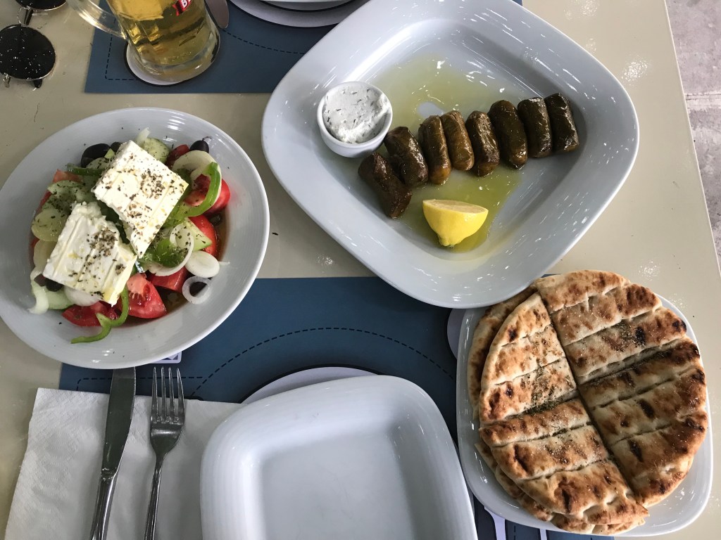 Después de esta visita a pie por el barrio de Plaka fuimos a un restaurante de comida griega: ensalada griega con el queso feta, las olivas,el tomate y el aceite de oliva. Los dolmades de origen otomano consisten en una mezcla de arroz,carne,cebolla,hierbas y vegetales envueltos en hojas de parra, y pan pita acompañado de la salsa de yogur Tzazaki. Generalmente, en los restaurantes ofrecen el postre y un licor como cortesía. En Atenas el licor es el Ouzo que es una bebida con sabor de anís.