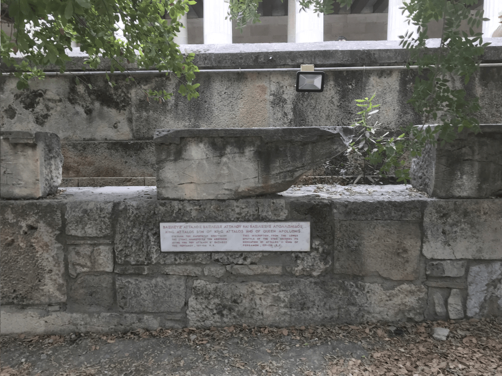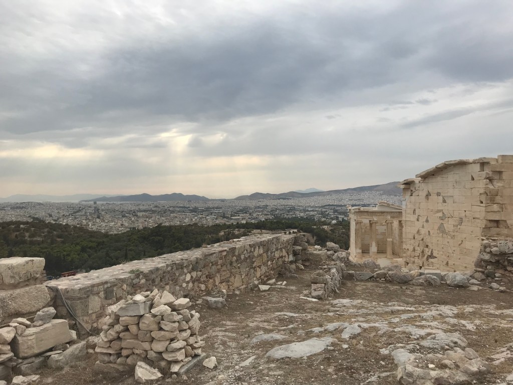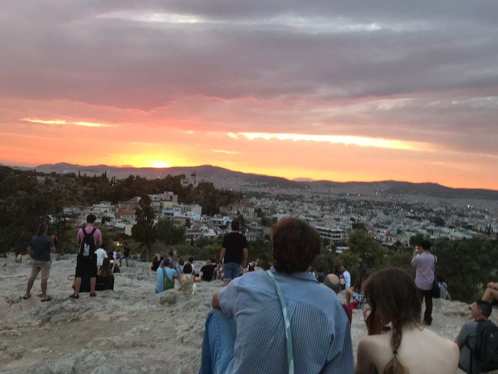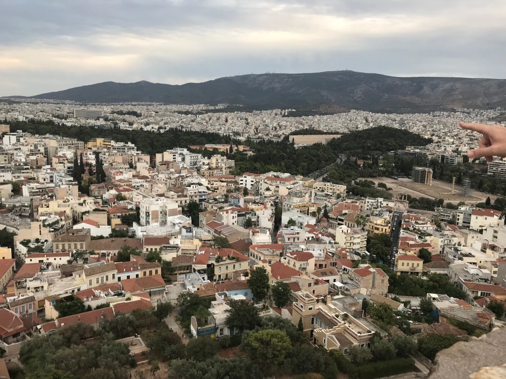 Desde este teatro tenemos una vista de la ciudad de Atenas. Podemos ver las siete colinas que rodean a Atenas. Una de estas colinas se llama Philopappos. En esta colina yace un monumento a Philopapppos, un hombre muy respetado de Atenas de origen sirio y allí quedaron sus restos. Su deseo era de estar enterrado en la parte más alta de la ciudad. La colina donde yace la Acrópolis fue escogida por los minoicos, primeros habitantes en los años 1000 a 1600 a.c porque era una colina donde había acceso al agua.