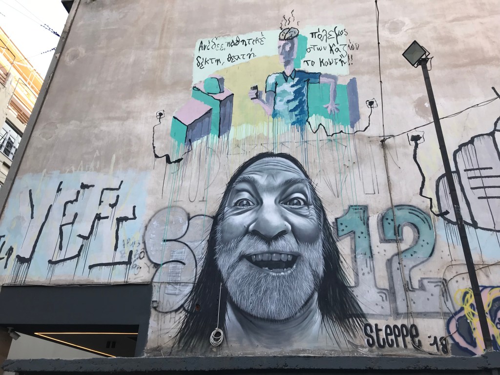 Después de visitar la iglesia de San Nicolas comenzamos el tour con un numeroso grupo de personas. La guía nos propuso caminar por el barrio durante quince minutos y después nos detendríamos para comentar lo que nos había llamado la atención. Exechia es un barrio con edificios de apartamentos mas que de casas. Muchos de estos edificios están ocupados por estudiantes porque la universidad esta situada en este barrio. Hay numerosos cafés. Uno de los hábitos cotidianos de los griegos es tomarse un café con los amigos en la mañana o en la tarde antes de entrar a casa. Cuando nos reunimos para comentar lo que habíamos visto, un aspecto que todos observamos fue la cantidad de grafitis en los muros del barrio. Había grafitis de todo tipo el de protesta, el artístico y el personal. Precisamente allí donde hicimos la primera parada sobresalían dos grafitis artísticos.