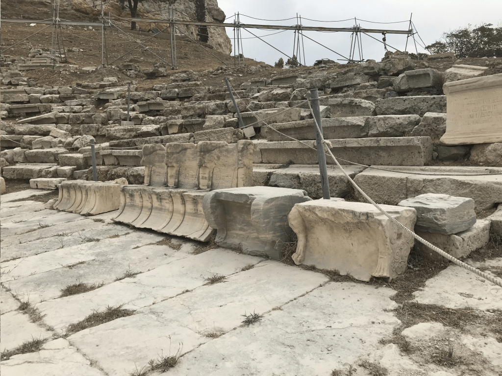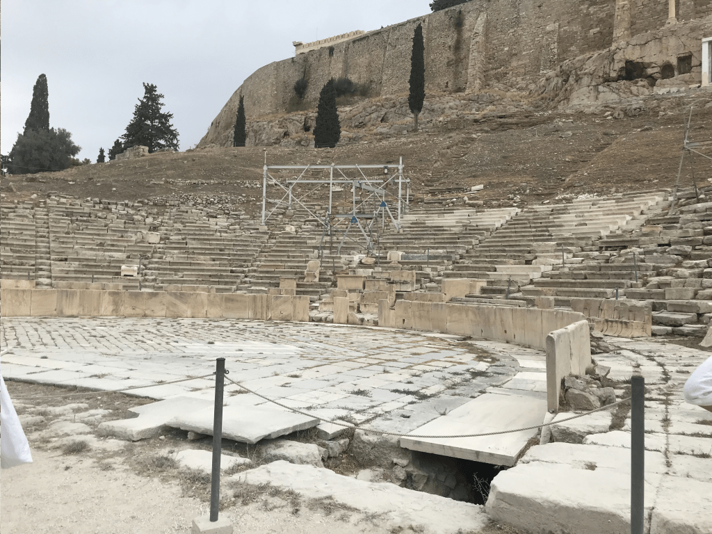 Después del ágora griego tomamos rumbo hacia la Acrópolis. Iniciamos nuestra visita en el teatro de Dionisios quien fue el Dios griego del vino, la danza, el teatro por eso los satíricos son sus compañeros de representación. Este teatro tenía la capacidad de albergar hasta 6000 personas. En las primeras filas de los espectadores podemos ver las sillas que eran reservadas a las personalidades políticas y culturales de la ciudad. Los griegos desde aquella época se distinguieron en la escritura y producción de las tragedias. Las obras de teatro se hacían a cielo abierto, los actores en el centro y había una estrada especial para los coristas estructura clave en la representación de las tragedias griegas. Pero también se presentaban comedias satíricas y dramas escritos por Esxilus,Sofocles,Euripides,Aristophanes.
