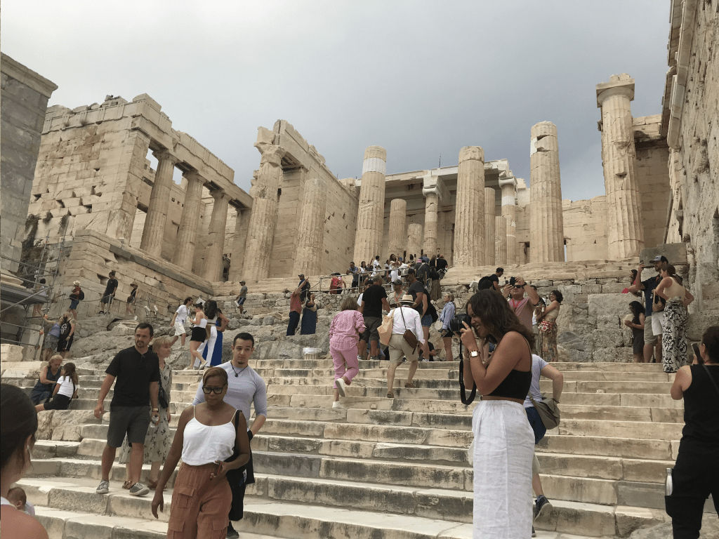 Continuando el recorrido por la Acrópolis, nos encontramos con los Propileos que eran columnas muy altas que daban acceso a la entrada de la Acrópolis. Esa entrada principal da acceso a un espacio amplio donde hay puertas laterales en total cinco puertas con la principal. El tener varias puertas de acceso a ese gran espacio se explica porque durante las fiestas Panatenaicas había miles de personas que acudían; por lo tanto, se necesitaban varias puertas de acceso y de salida. Al pasar la puerta principal podemos ver una gran base donde estaba la estatua de Agrippa quien era yerno del emperador Augusto y quien gobernó Grecia a comienzos de la era cristiana. Los romanos estuvieron en Grecia durante 300 años.