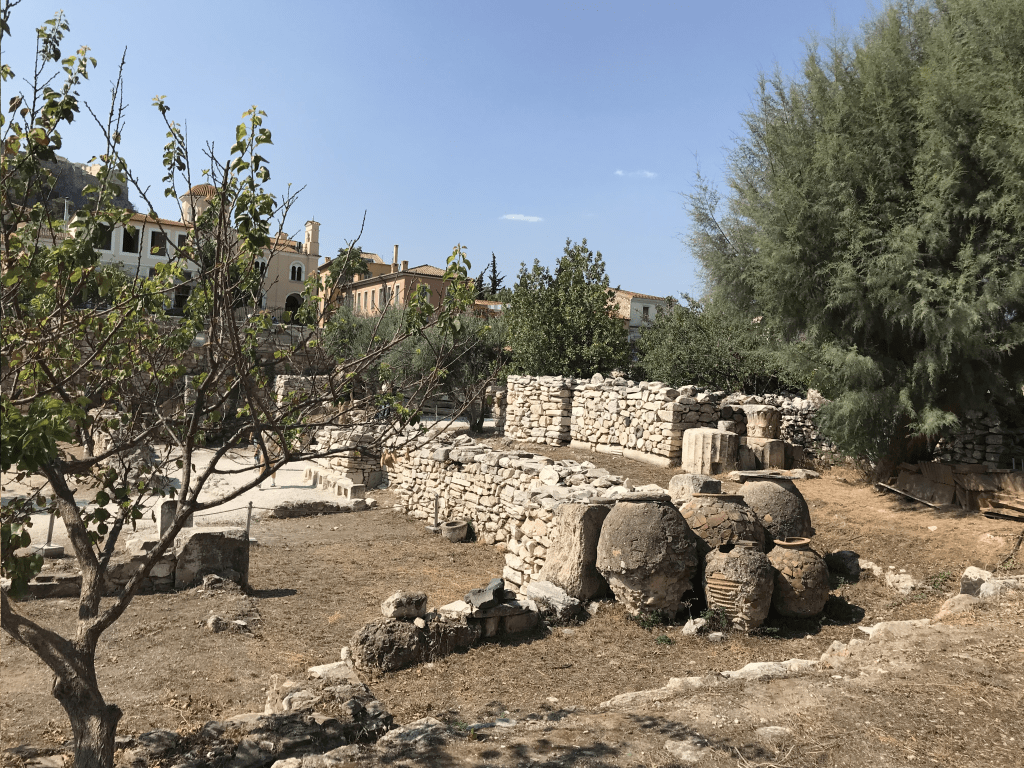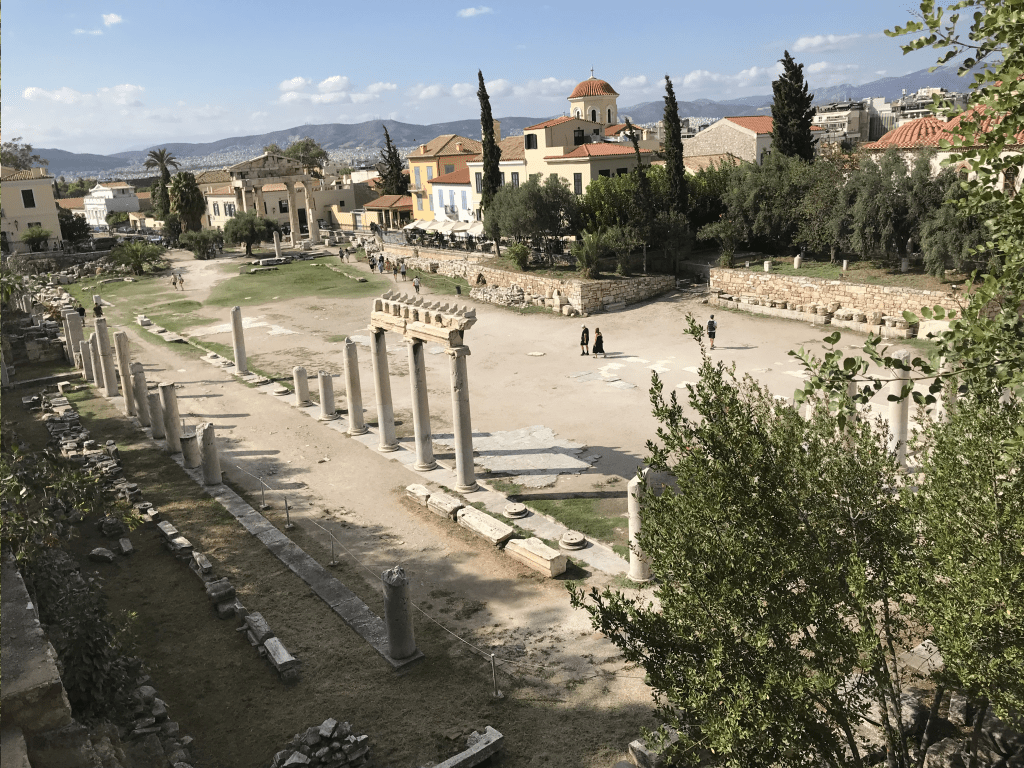 El ágora romana se encuentra en el barrio de Plaka. Las dos estructuras más destacadas que se mantienen de la época romana es la torre de los vientos y la puerta de Atenea Arquegetis. Esta última es una puerta monumental que consiste en cuatro columnas dóricas con un amplio frisón. Al interior del ágora romana se ve la mezquita Fethiye porque después de los romanos vinieron los bizantinos y posteriormente los Otomanos. Por lo tanto, el ágora romano y sus alrededores se convirtieron en un barrio con casas,talleres,iglesias y mercados.