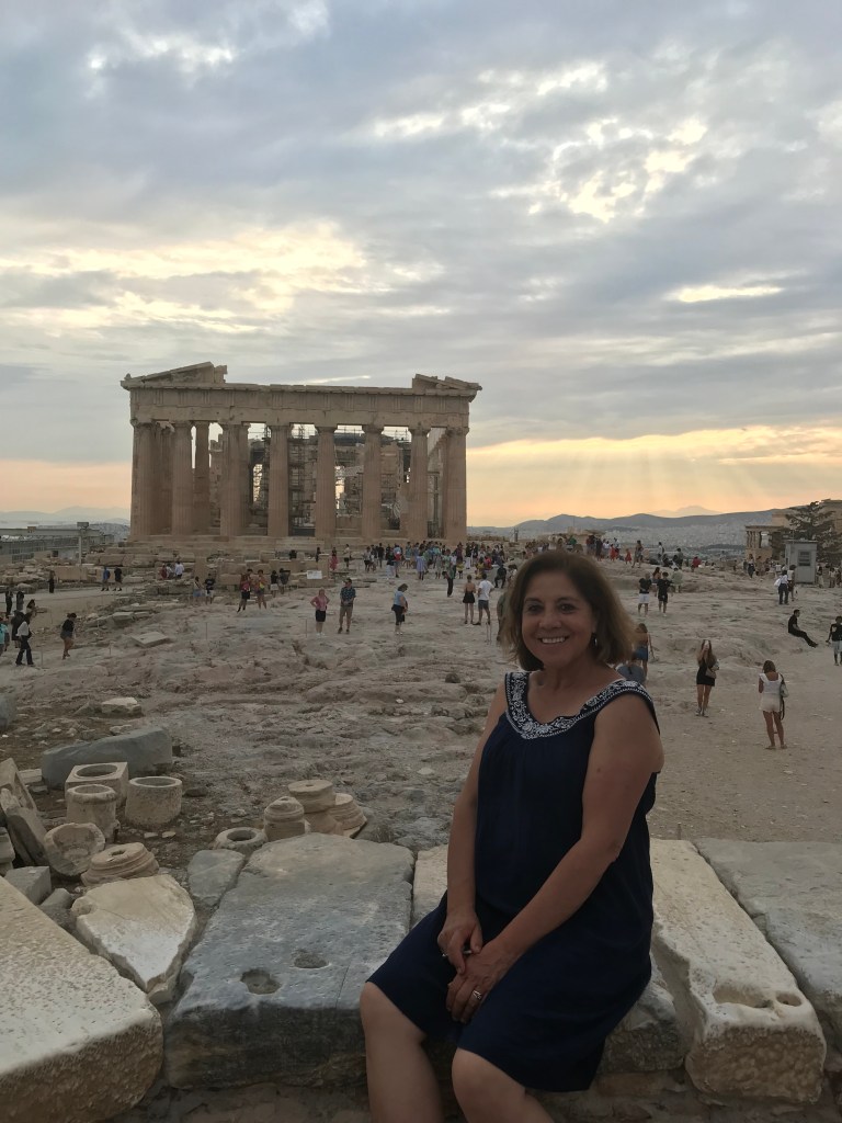 El Partenón aparece ante nuestros ojos una vez se atraviesa la puerta de entrada a la Acrópolis. Para los griegos de la antigüedad el Partenón es el lugar donde residen los 12 dioses de la mitología griega. Este templo fue dedicado a Atenea. Partenón significa en griego virgen, mujer no casada. Se escogió este lugar para construir el Partenón y los otros templos porque esta colina era la más alta de toda Atenas. Fue Pericles que lo hizo construir en el siglo V a.c. Su construcción tomó diez años entre el 447 y el 437 a.c. Los arquitectos que construyeron el Partenón y los otros templos fueron Ictinus,Callicrates,Agoracritos y Alcamenas. Estos arquitectos al hacer el plano del Partenón y en la ejecución del trabajo crearon ilusiones ópticas en la disposición de las columnas. Otro edificio importante es el Erecteion con una tribuna sostenida por seis cariátides. La visita a la Acrópolis finaliza con la puesta del sol que desde este lugar es espectacular. Se tiene por un lado la vista al mar Mediterráneo y las montañas. Y del otro lado una vista general de la ciudad de Atenas donde es remarcable ver que no hay edificios muy altos porque no se puede construir edificios que sean más altos que la Acrópolis. La Acrópolis es el lugar emblemático para los atenienses. Estas edificaciones antiguas tocadas por los rayos del sol realzan su belleza.