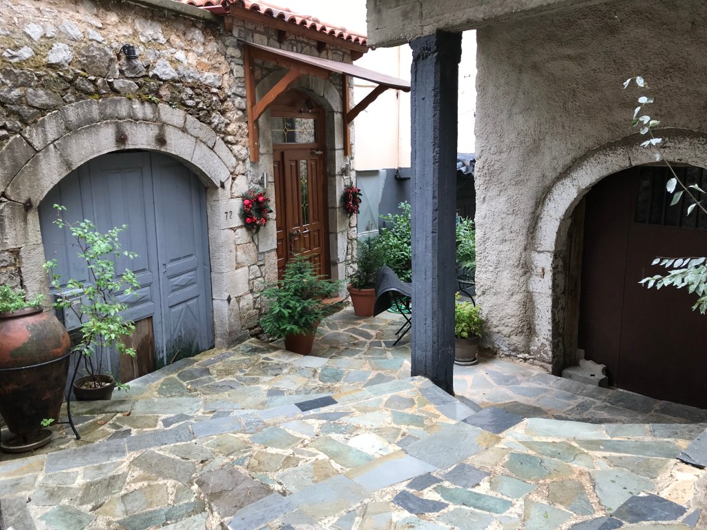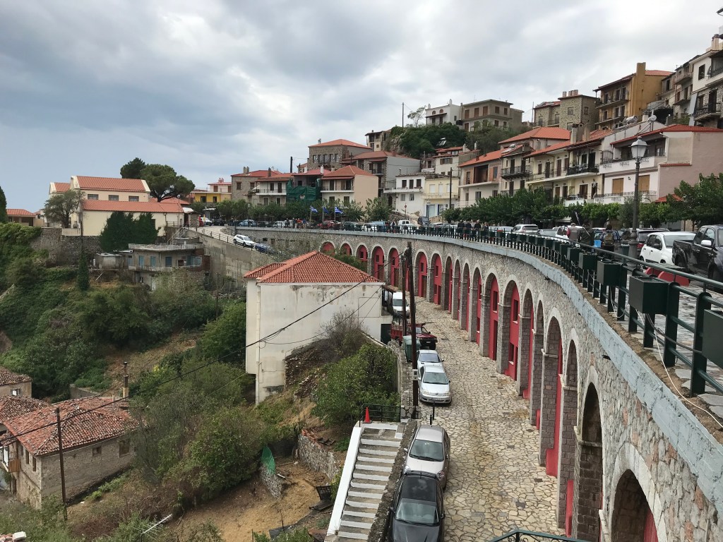 Lo increíble de este pueblo es que la piedra está omnipresente por las calles que lo constituyen, pero también las viviendas son de piedra. Esto le da un carácter arquitectónico particular y a la vez acogedor. Las casas decoradas con la imagen de algun dios griego y en el techo de ladrillo un pajaro de cobre o hierro, simbolo del dios Apolo. En las entradas de las casas se ven grandes jarras de barro que junto con los materos de flores le dan un gran realce a las casas. A medida que se van subiendo las escaleras de piedra, en la parte alta se ven las casas más bonitas. Encontramos varias iglesias ortodoxas entre ellas la de st Georgios. Se puede saber que se ha llegado a una iglesia ortodoxa porque hay una columna con una pequena escultura de una iglesia ortodoxa.