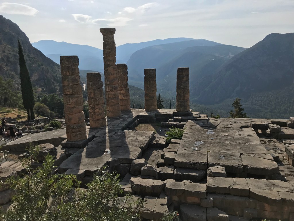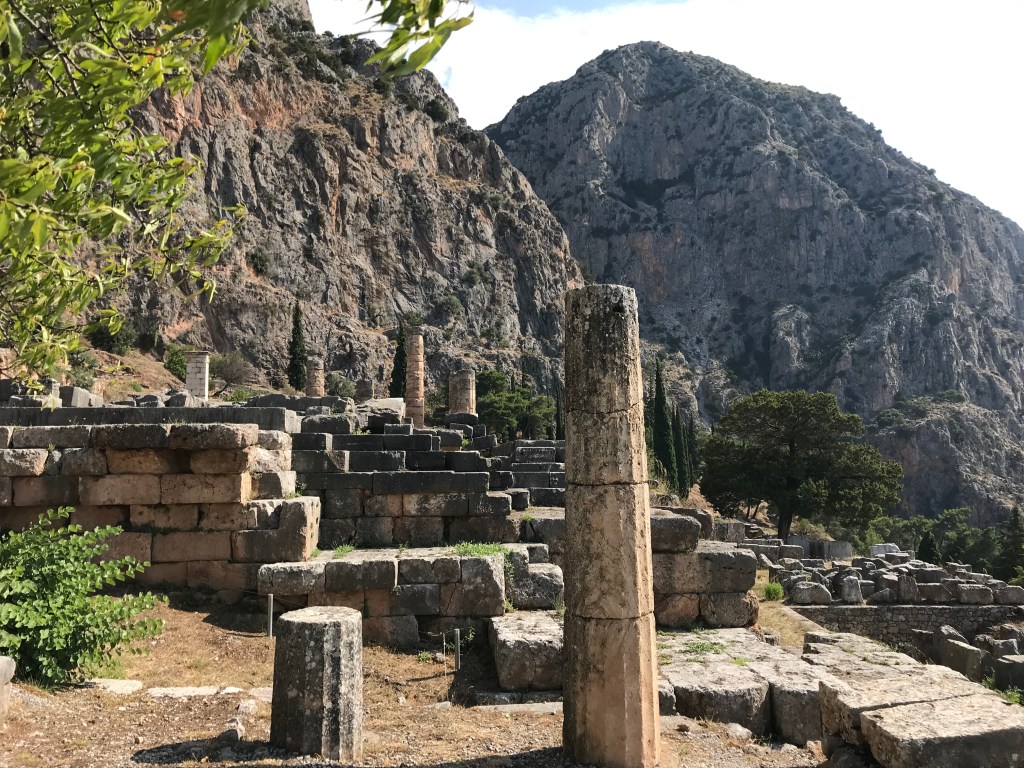 El sitio arqueológico de Delfos fue uno de los sitios religiosos más importantes de Grecia desde el siglo VI a.c. hasta la época romana. Yendo hacia el templo de Apolo se toma la vía sagrada. A los costados de esta vía encontramos los obsequios y ofrendas de agradecimiento que diferentes pueblos griegos ofrecieron al dios Apolo. En la parte alta de la vía sagrada encontramos el lugar donde los antiguos griegos erigieron el templo de Apolo. Hoy quedan solamente seis columnas de este templo.