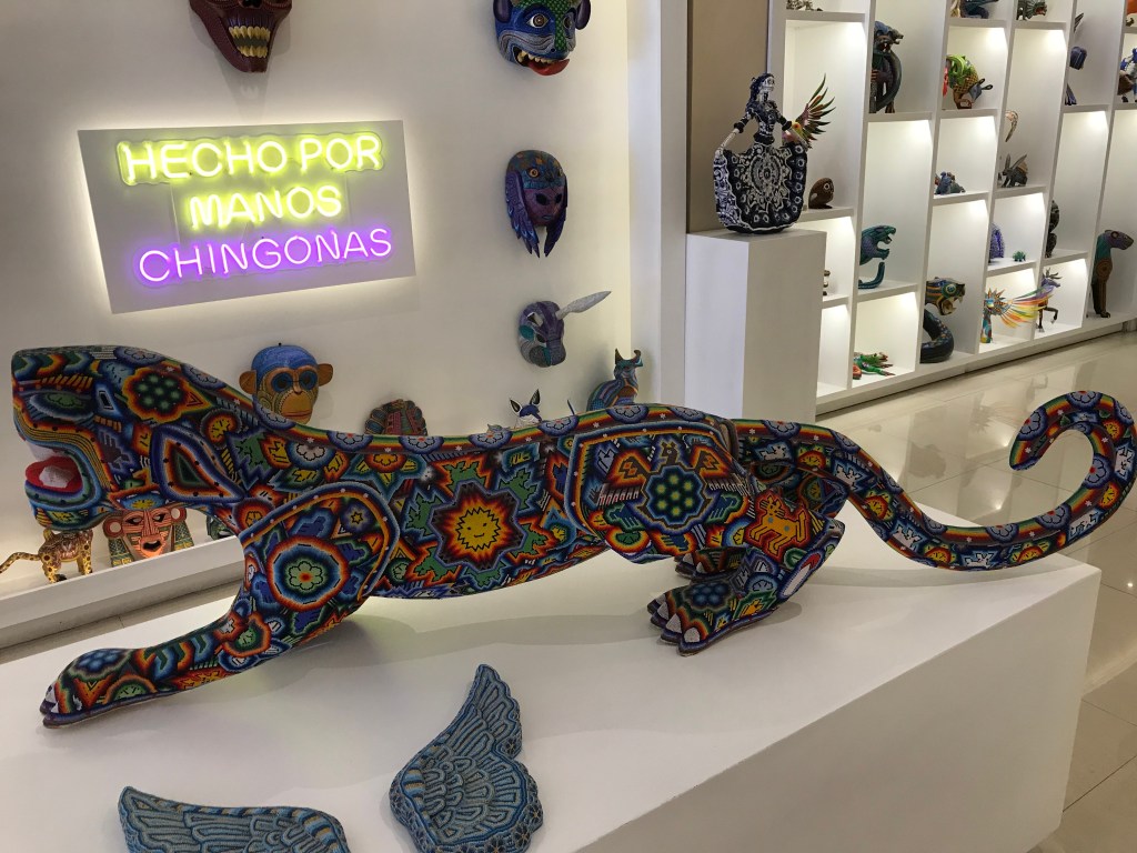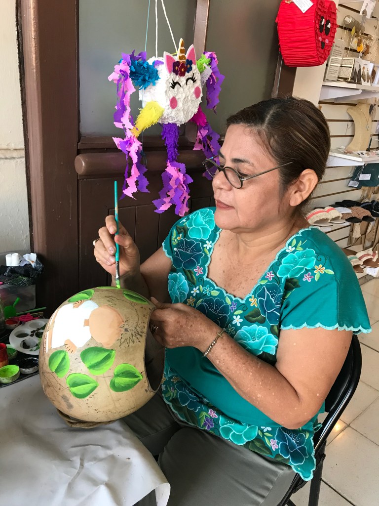 En Chiche Itzá encontré a José que estaba esculpiendo un hermoso jaguar en madera. Me dijo que aprendió a esculpir la madera a los doce años con su abuelo. Esculpe animales emblemáticos como el jaguar que para los pueblos mayas es símbolo de fuerza, sabiduría y protección. También se gana la vida esculpiendo escudos con los símbolos de diferentes equipos de fútbol. La madera que utiliza es el cedro, corta una pieza, la dibuja y luego la talla. Para darle el color utiliza fibras vegetales como el achiote y otras provenientes de flores y plantas.