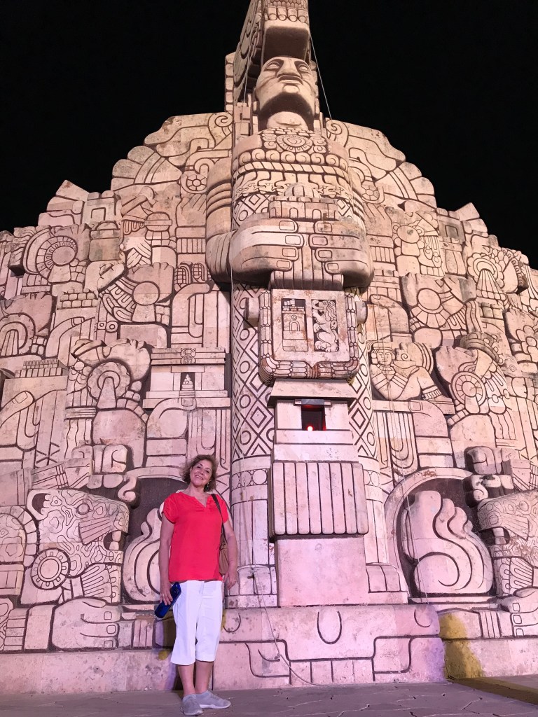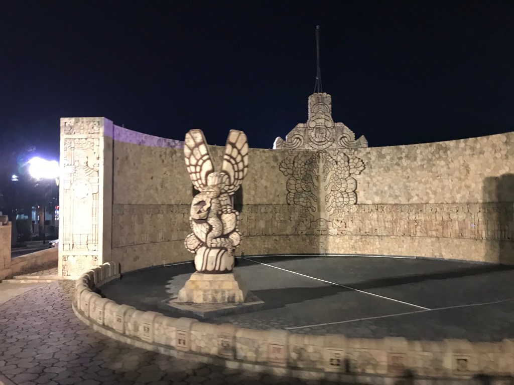 Un domingo soleado paseando por el Paseo de Montejo en Mérida, un ambiente de festejo se vive por las calles que ese día cierran la vía para darle paso a las bicicletas y a los transeúntes que salen a hacer ejercicio y a pasear. Comencé el recorrido por el Paseo de Montejo en el Monumento a la Patria. Un monumento tallado en piedra que cuenta la historia de México desde la época prehispánica hasta el México moderno. Los personajes que han marcado la historia de México y sus realizaciones, así como dos de los eventos importantes de la historia como fue la independencia de España y la revolución mexicana. La parte central del monumento es una mujer maya rodeada de símbolos mayas como el jaguar, el chac moole, los caracoles, flores y otros animales.